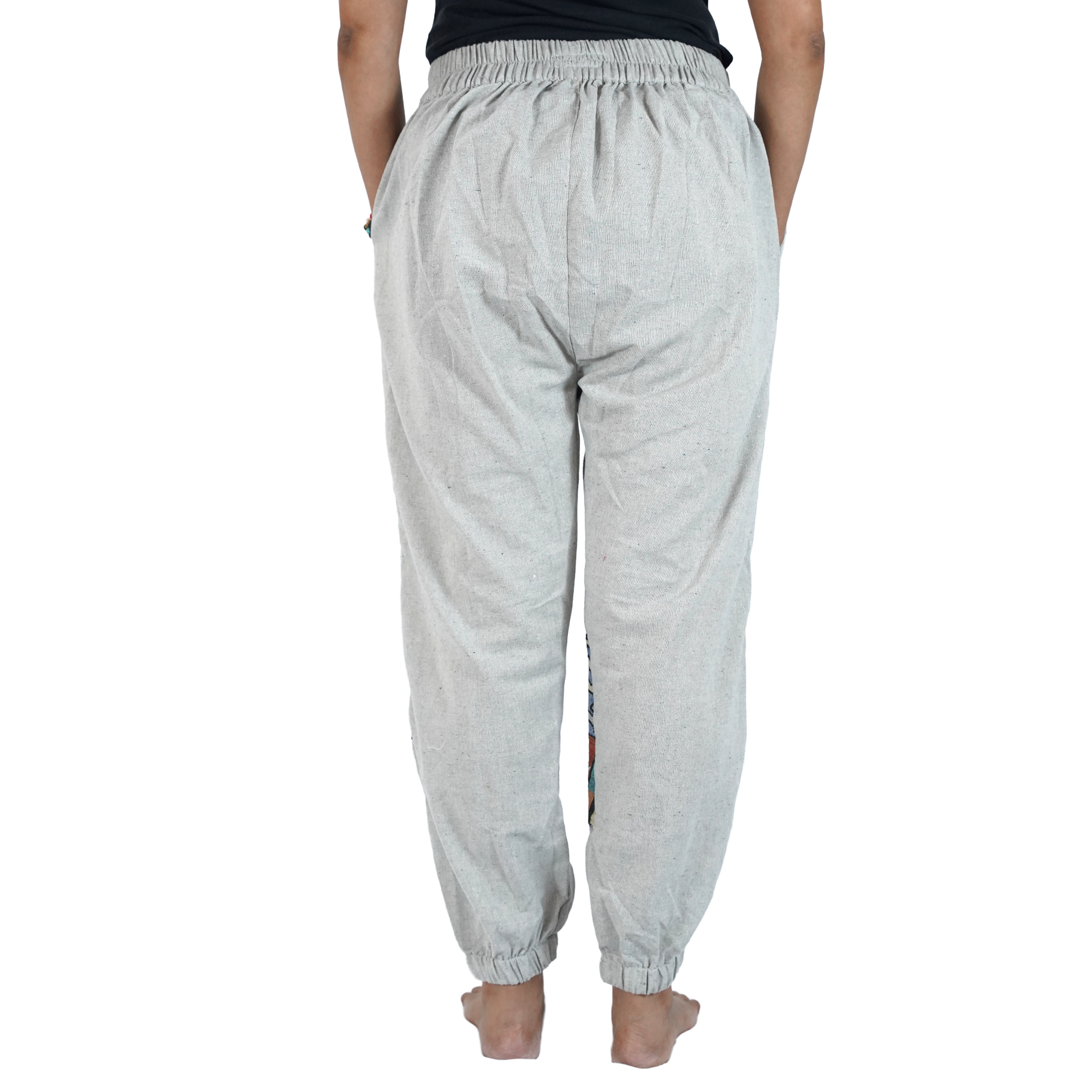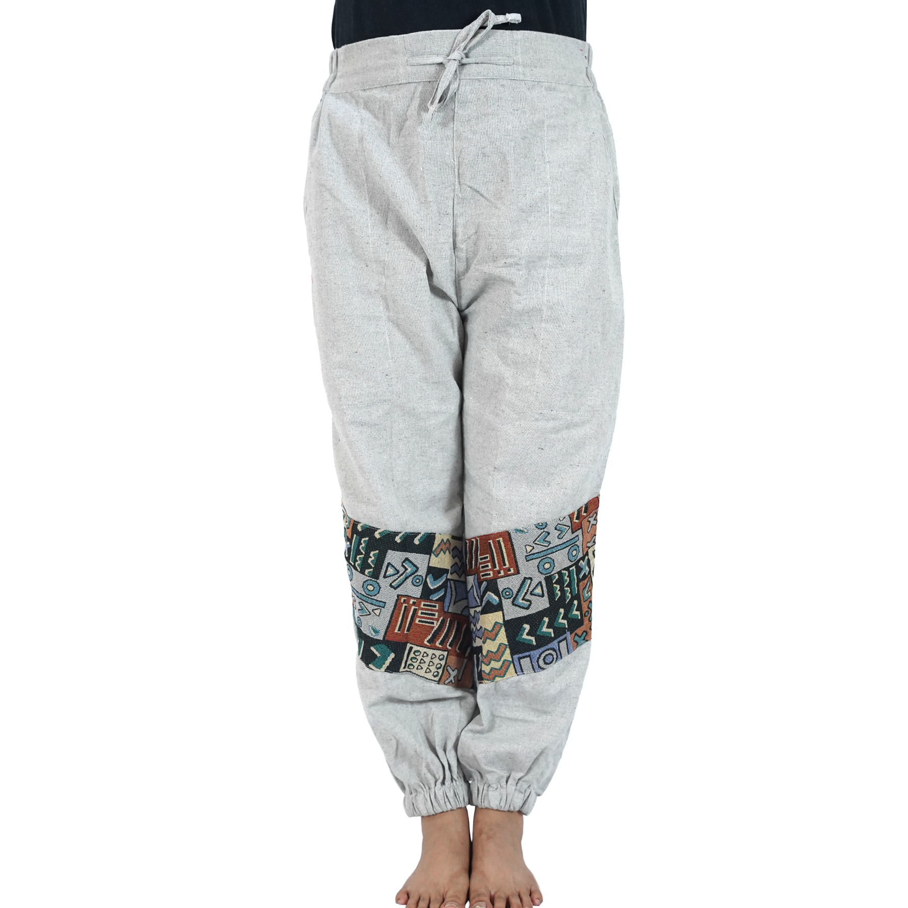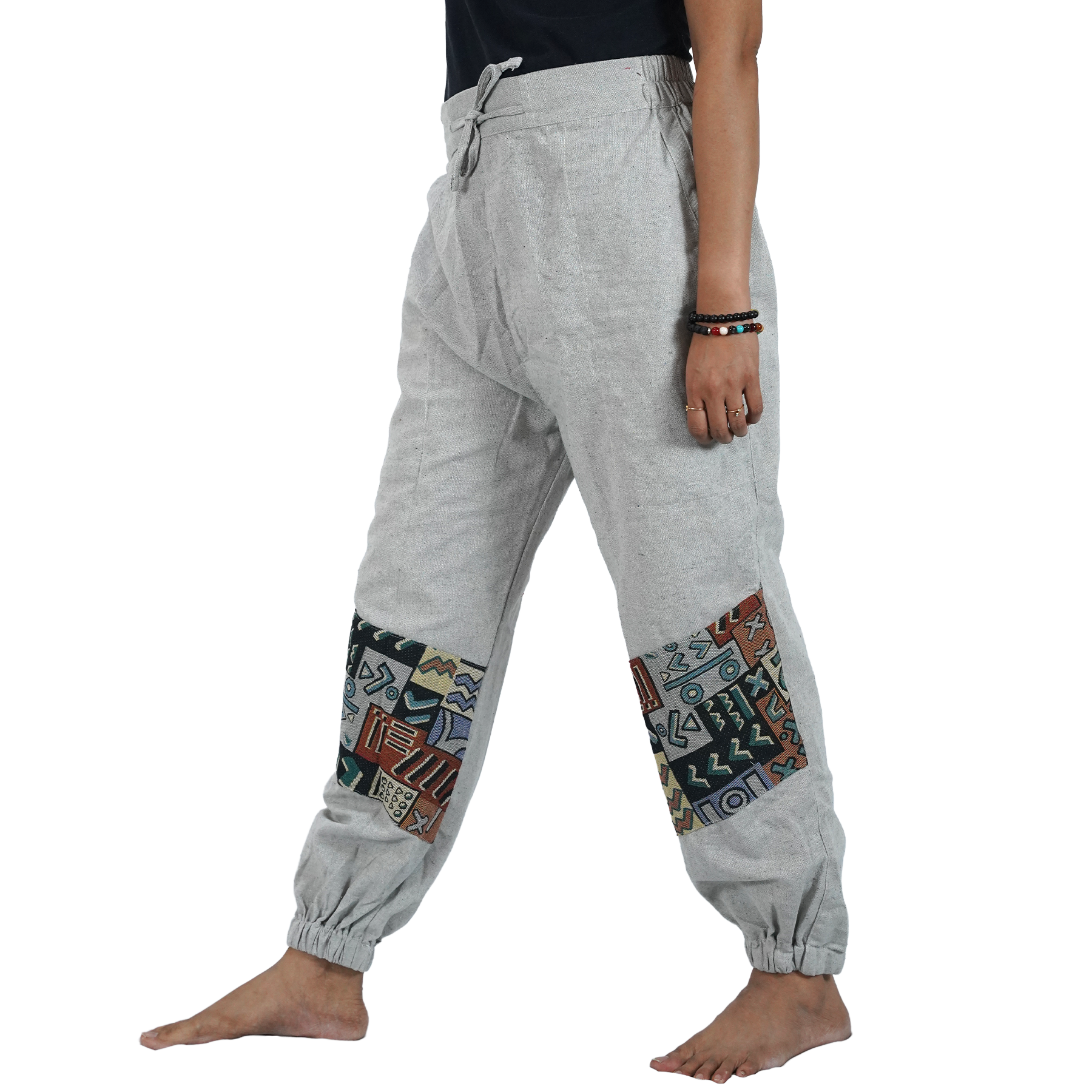 Add a playful bohemian edge to your wardrobe with the Satyugyoga Yippie Hopper Pants in ash grey, detailed with vibrant multicolor patchwork at the legs for a striking contrast.