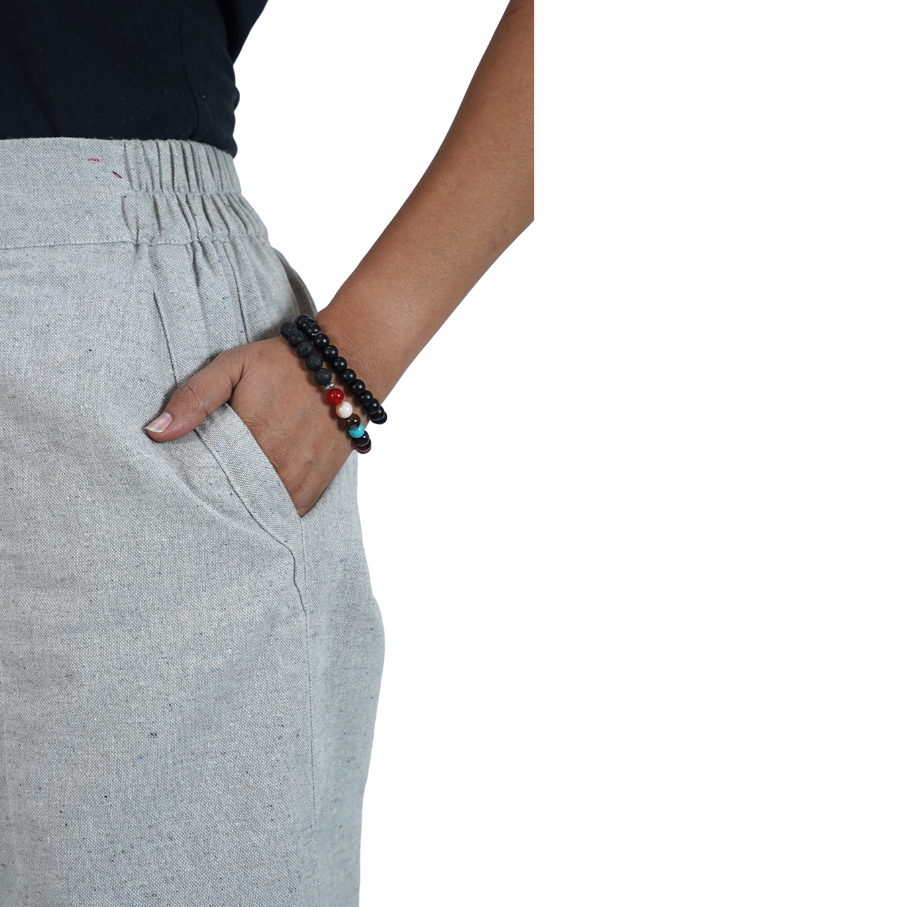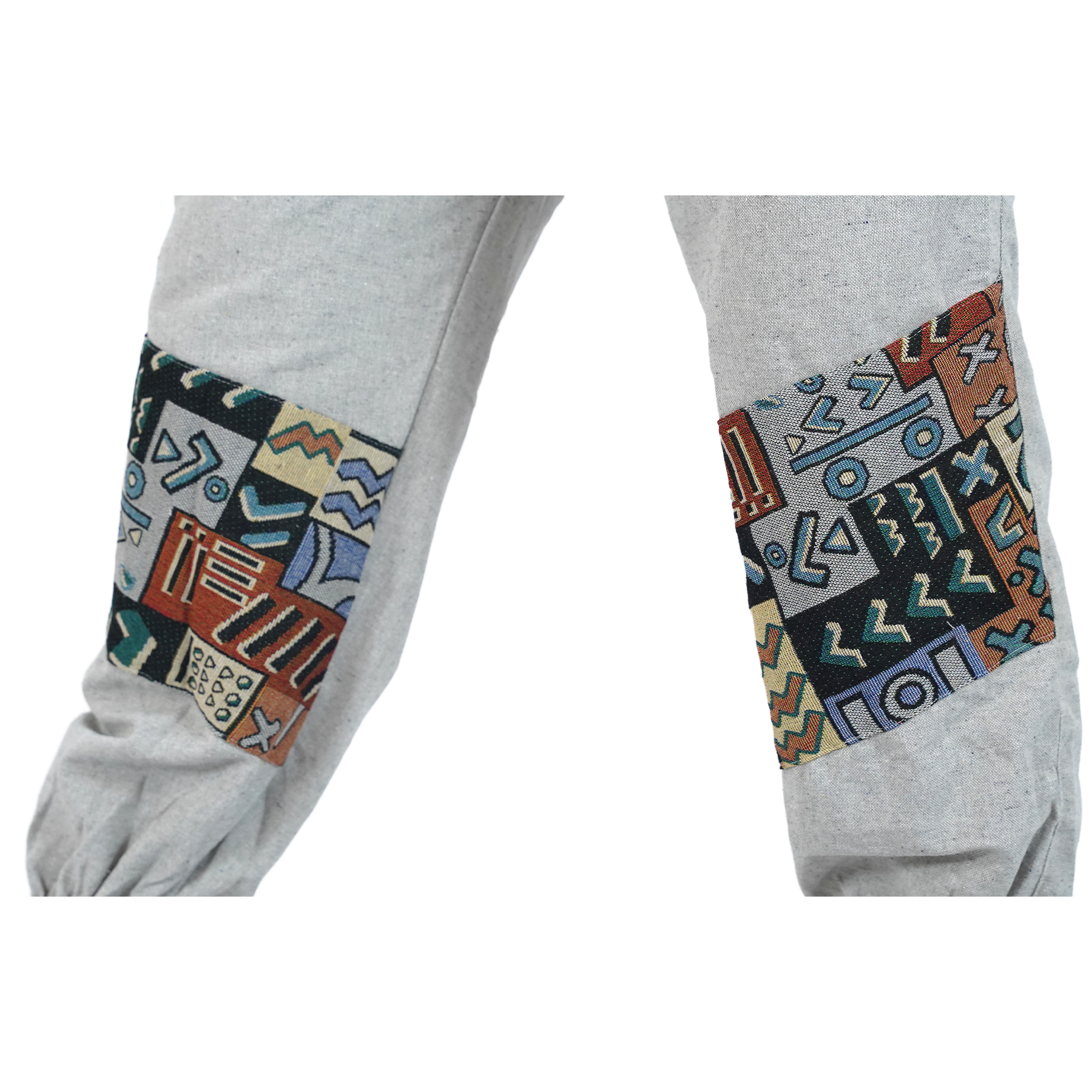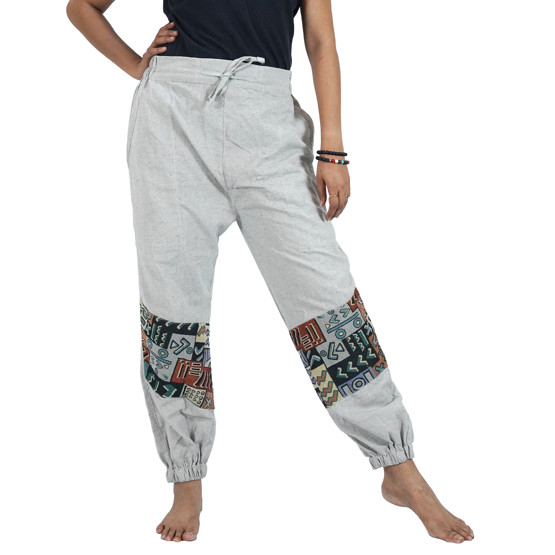 Add a playful bohemian edge to your wardrobe with the Satyugyoga Yippie Hopper Pants in ash grey, detailed with vibrant multicolor patchwork at the legs for a striking contrast.