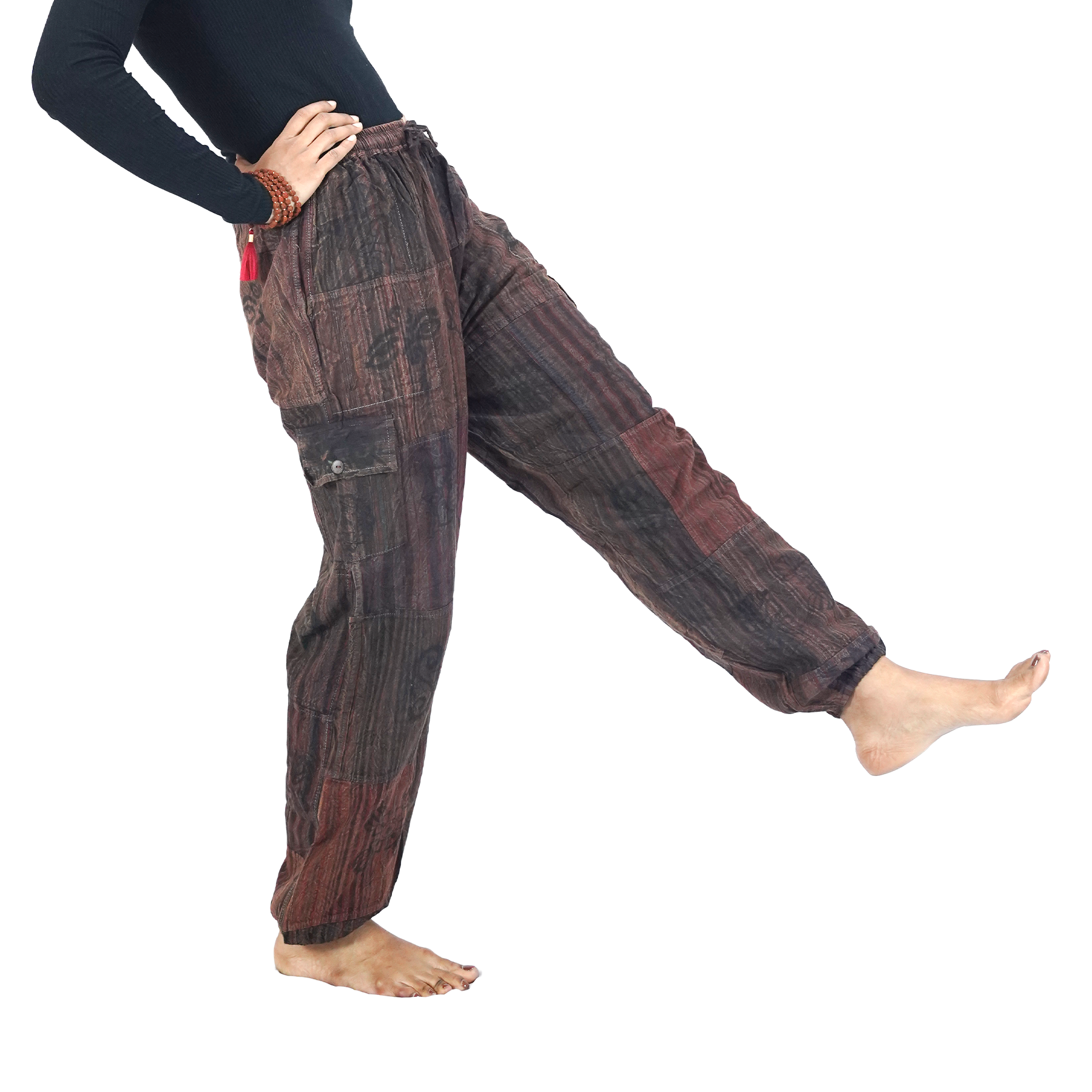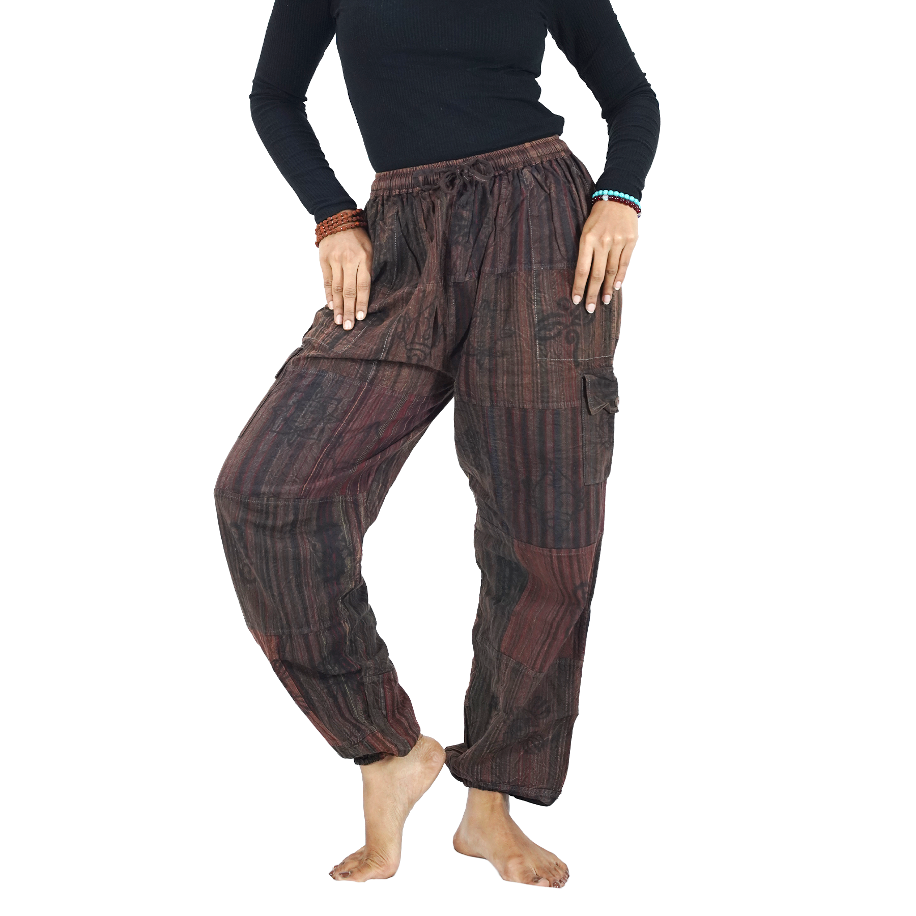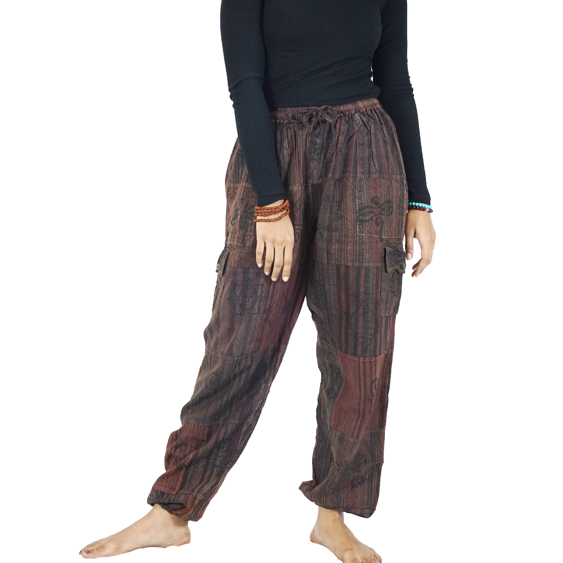 Bring a bold edge to your bohemian look with the Satyugyoga Classic Straight Harem Premium Patchwork Pants in blackish brown and red stripes.