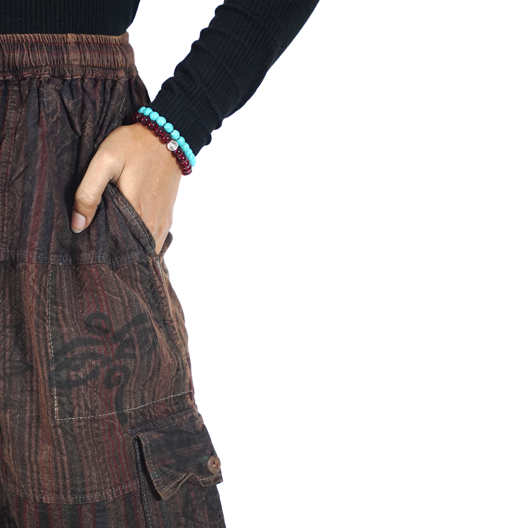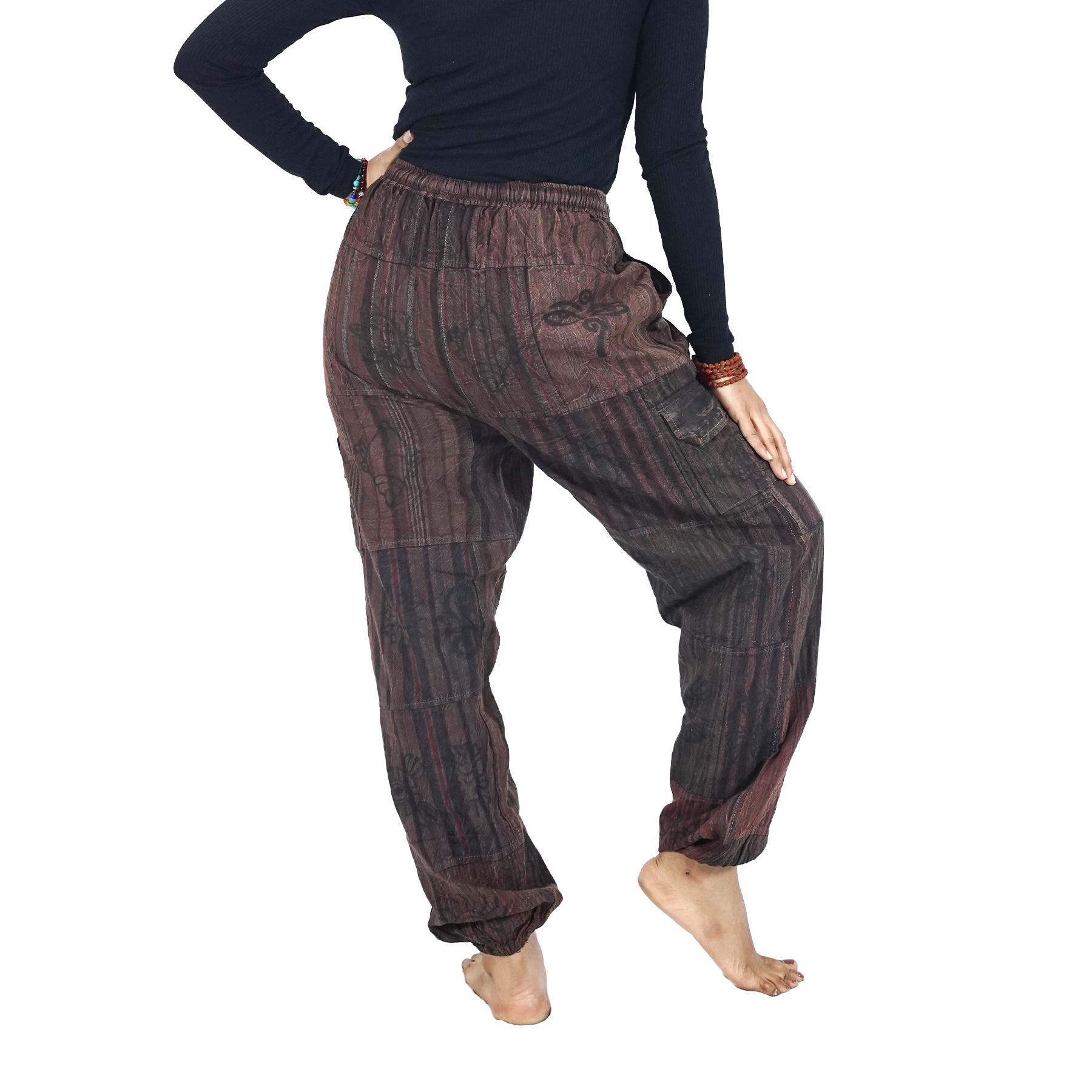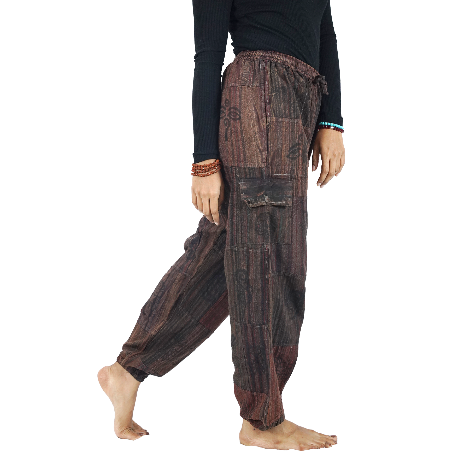 Bring a bold edge to your bohemian look with the Satyugyoga Classic Straight Harem Premium Patchwork Pants in blackish brown and red stripes.
