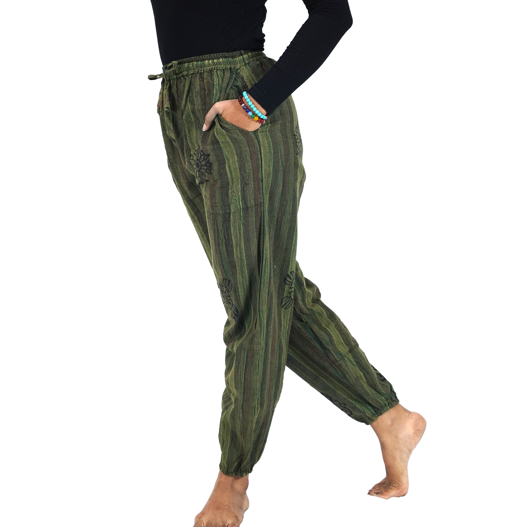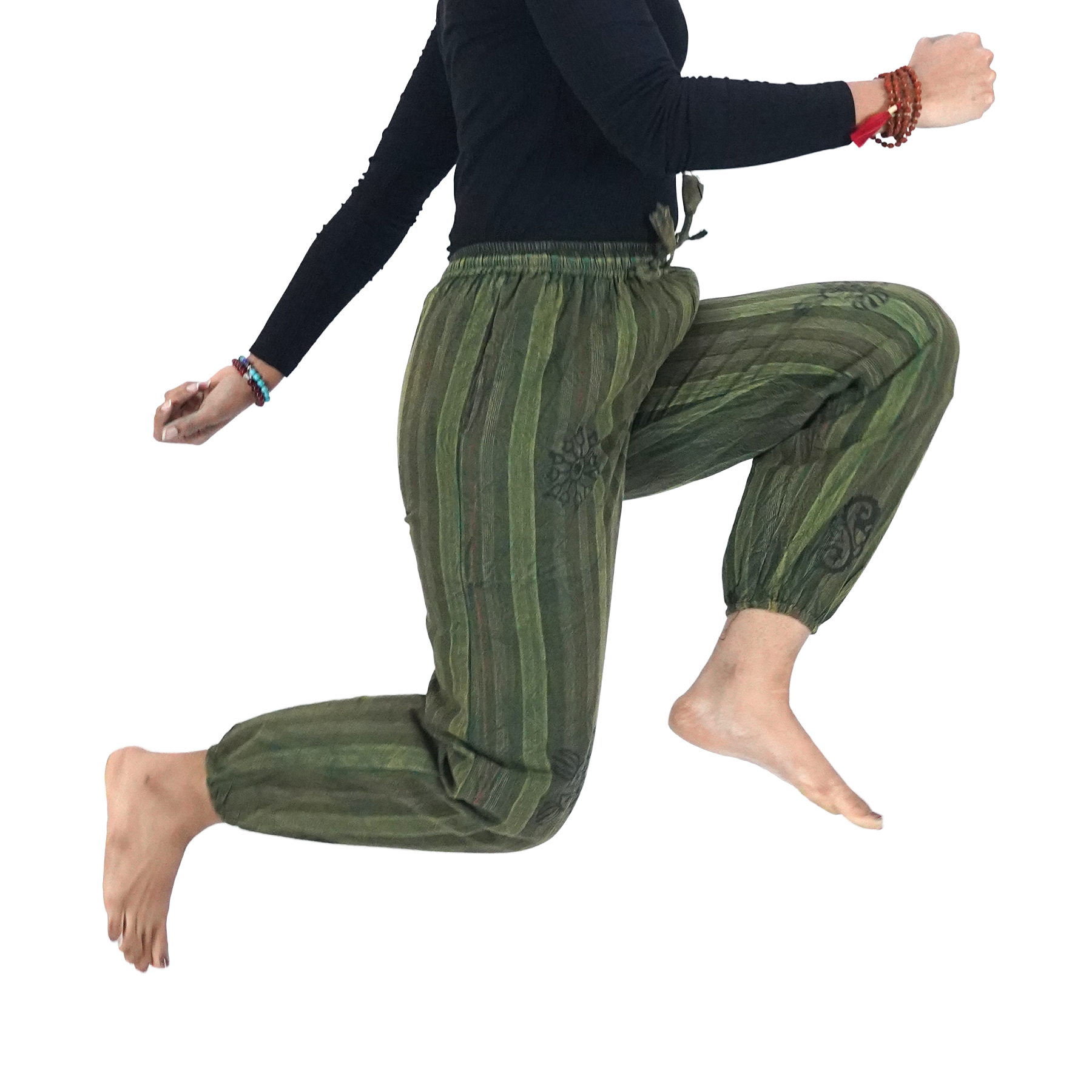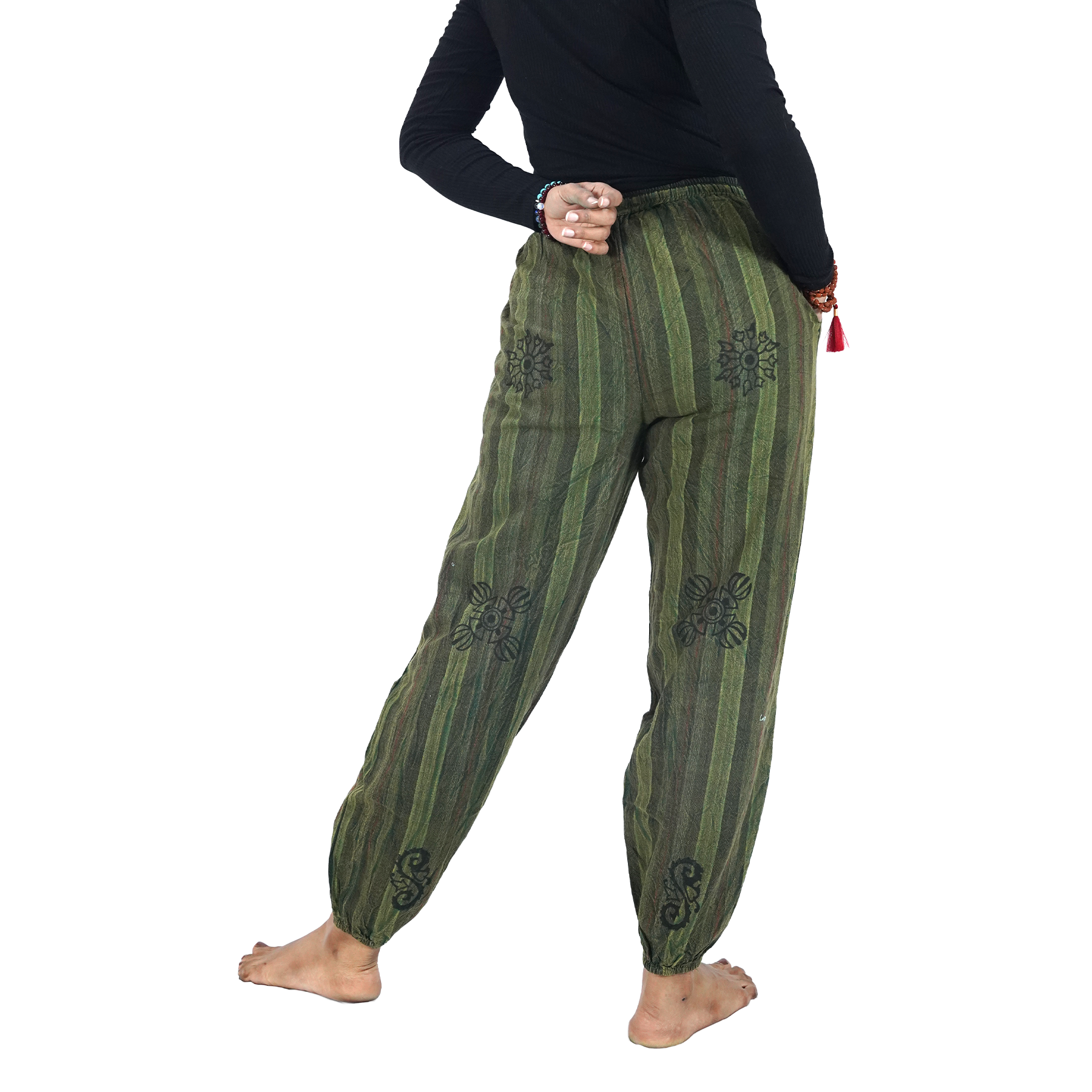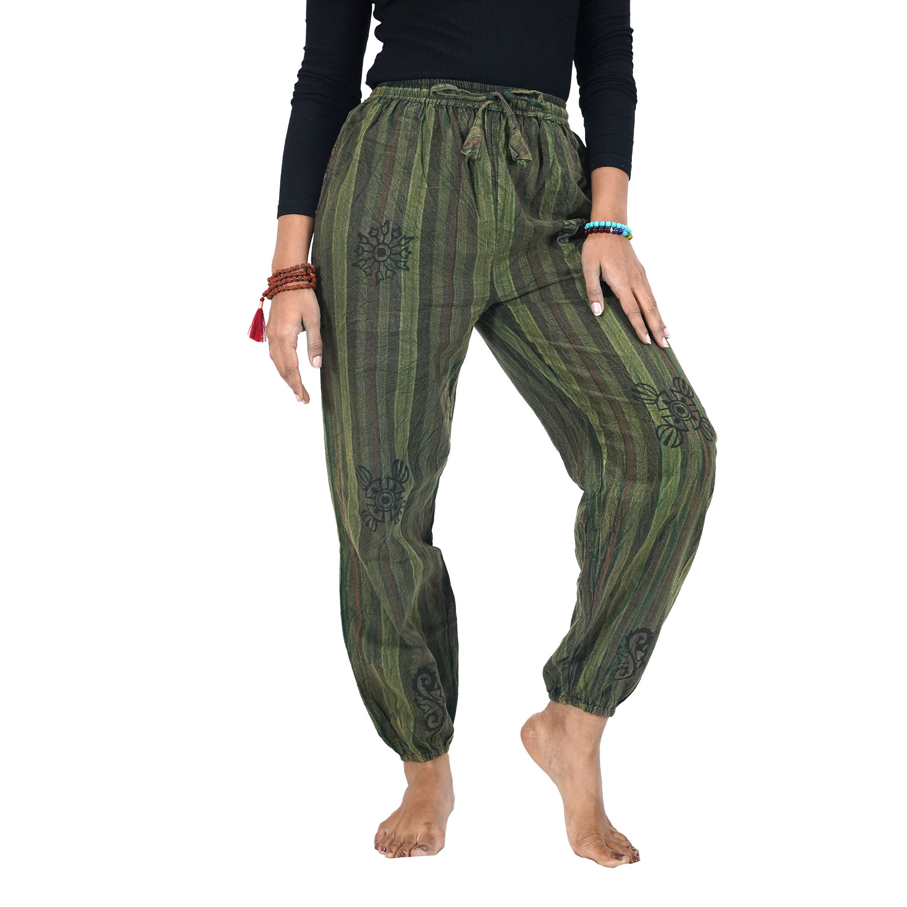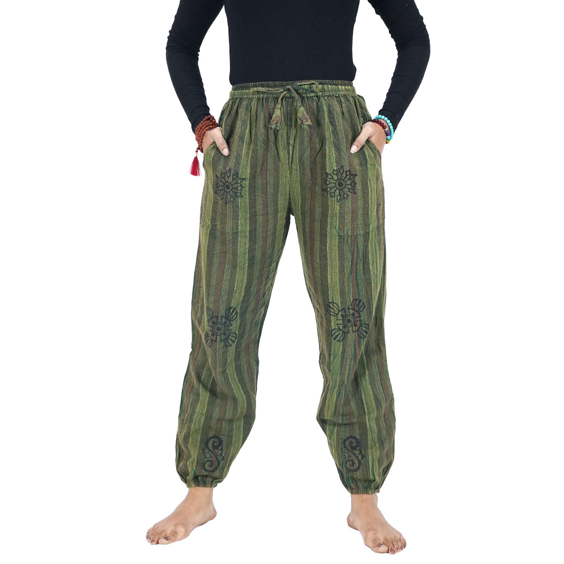 Made from soft cotton, these pants keep you cool and comfortable throughout the day. The elastic ankle cuffs give a snug yet easygoing fit, while the free-size cut ensures freedom of movement and adaptability.