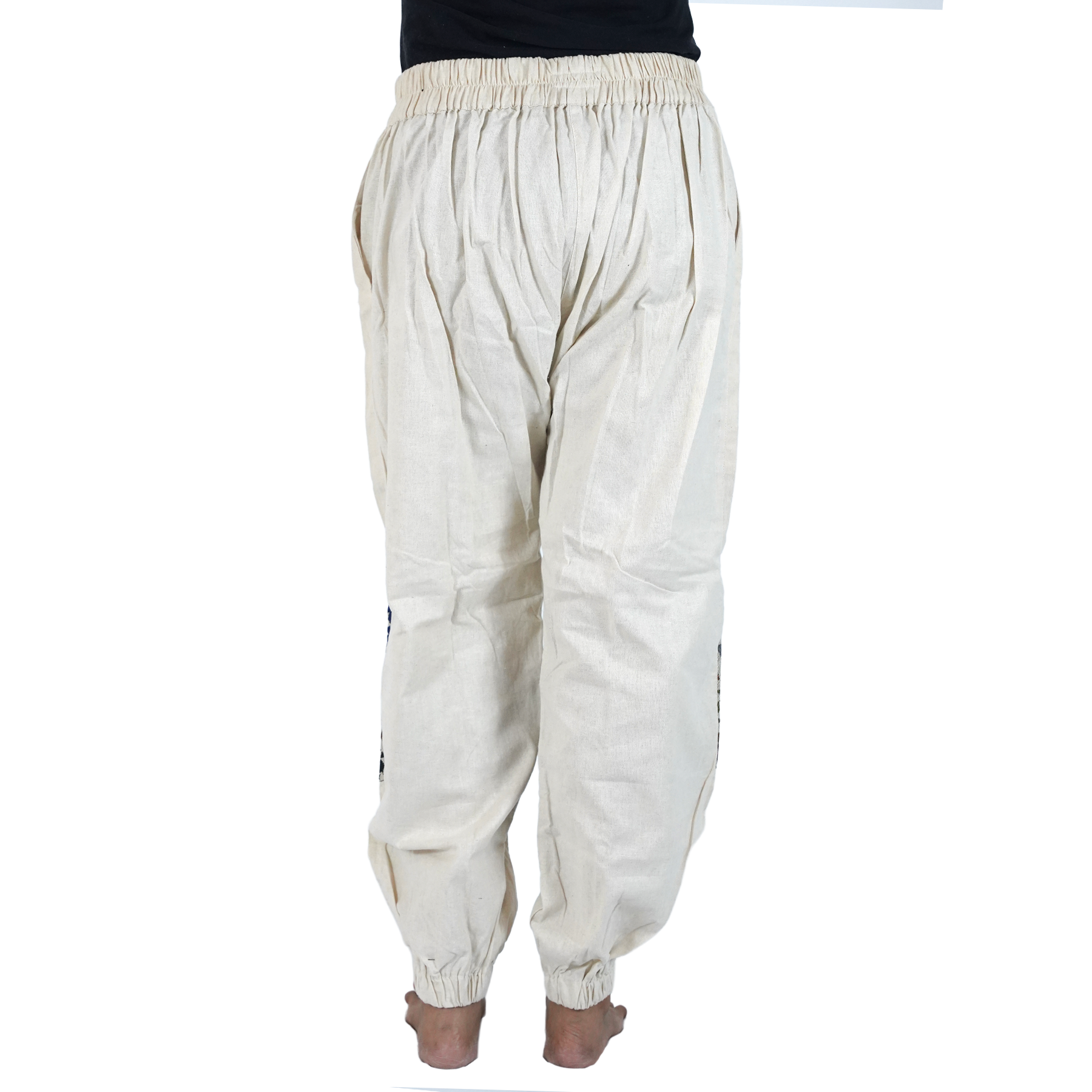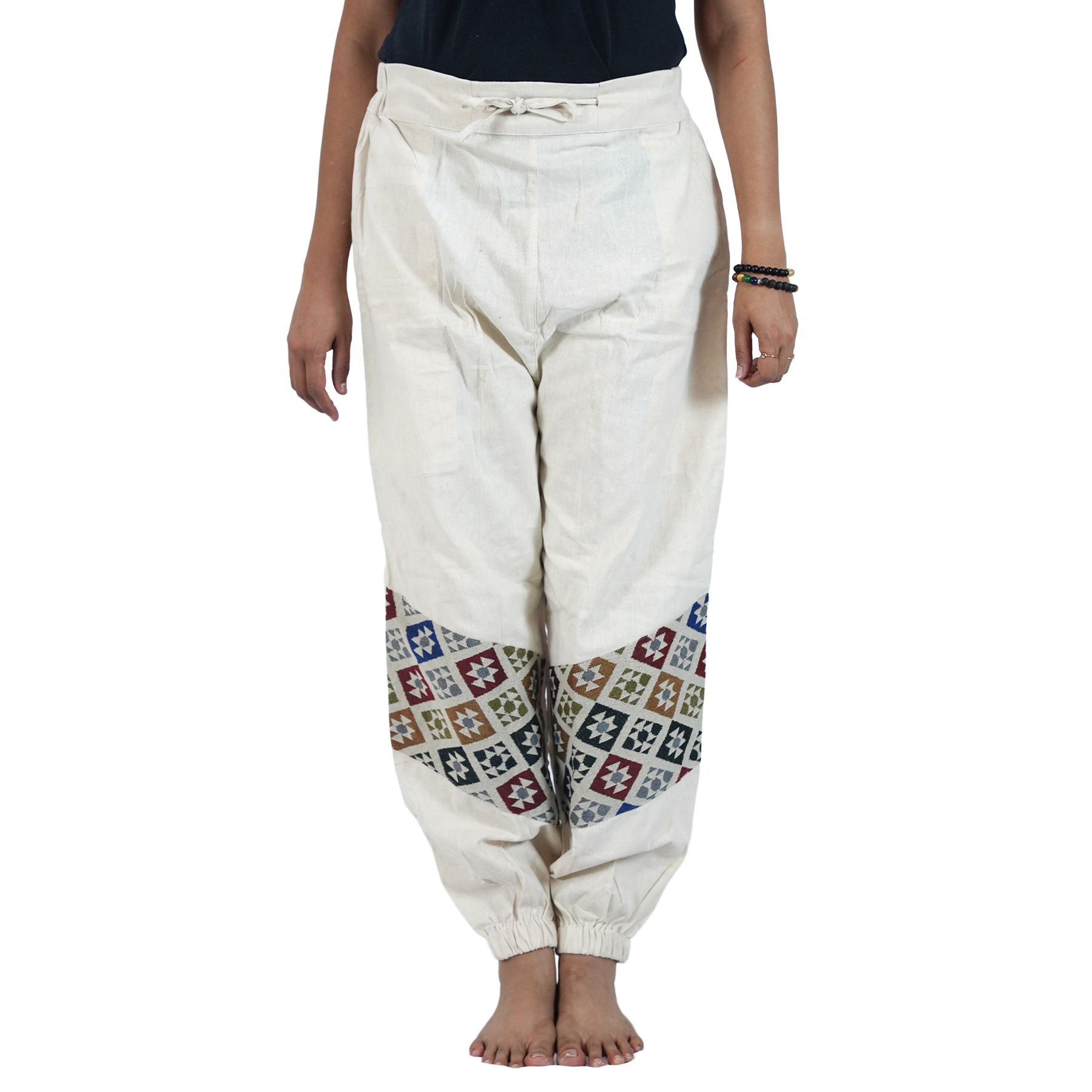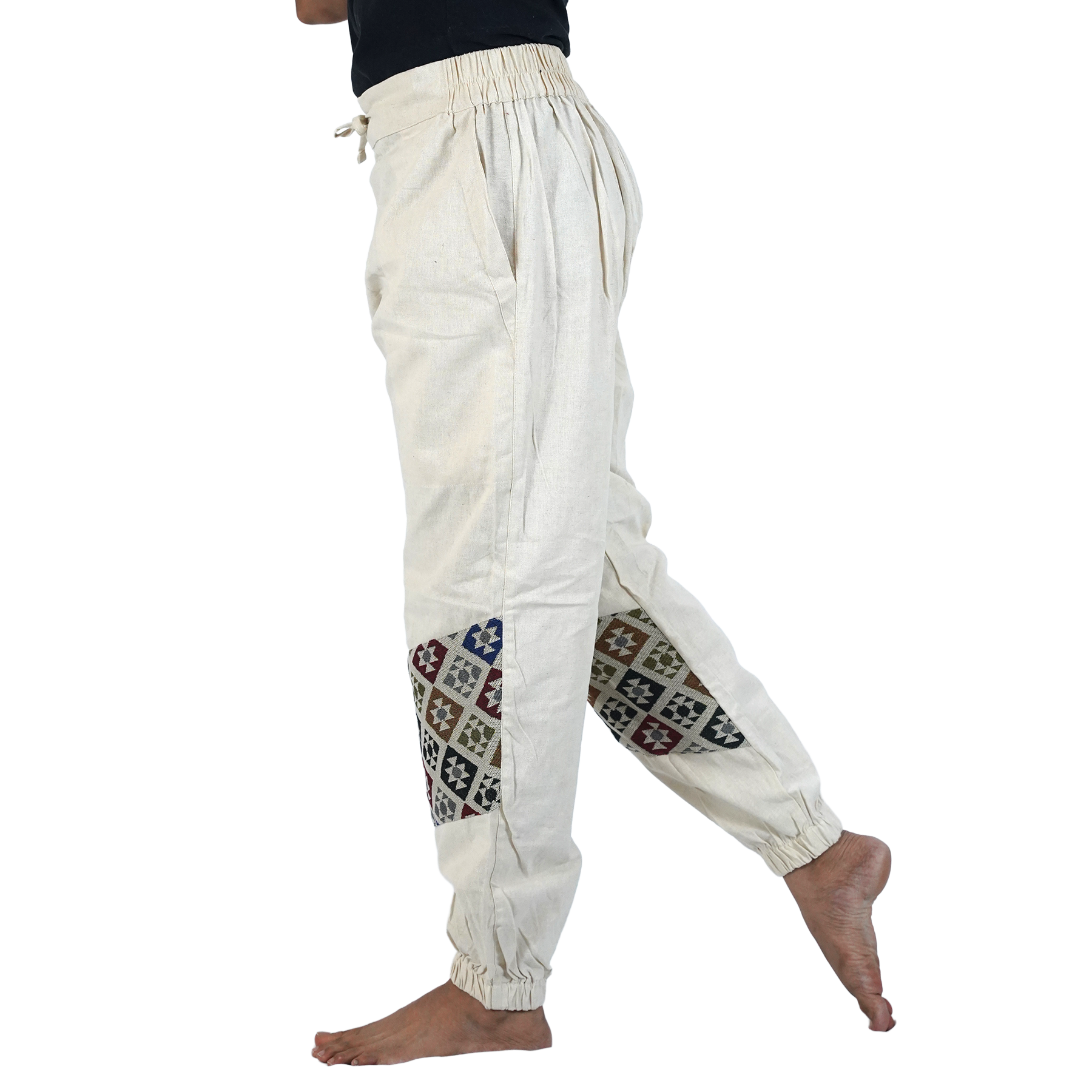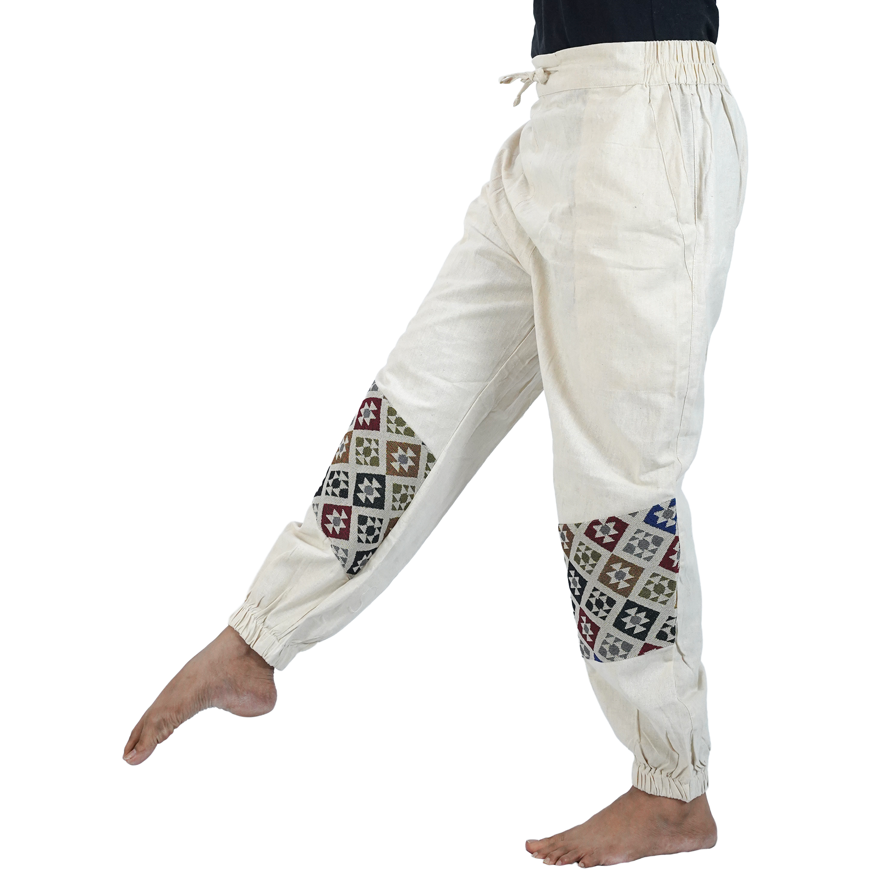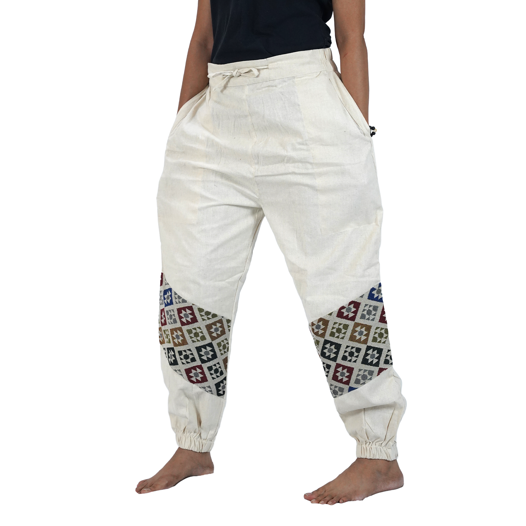 Elevate your casual wear with the Satyugyoga Yippie Hopper Pants in Off White, enhanced by multicolor diamond patchwork around the legs for a vibrant, bohemian flair. These pants blend earthy elegance with artistic detail for a standout look.