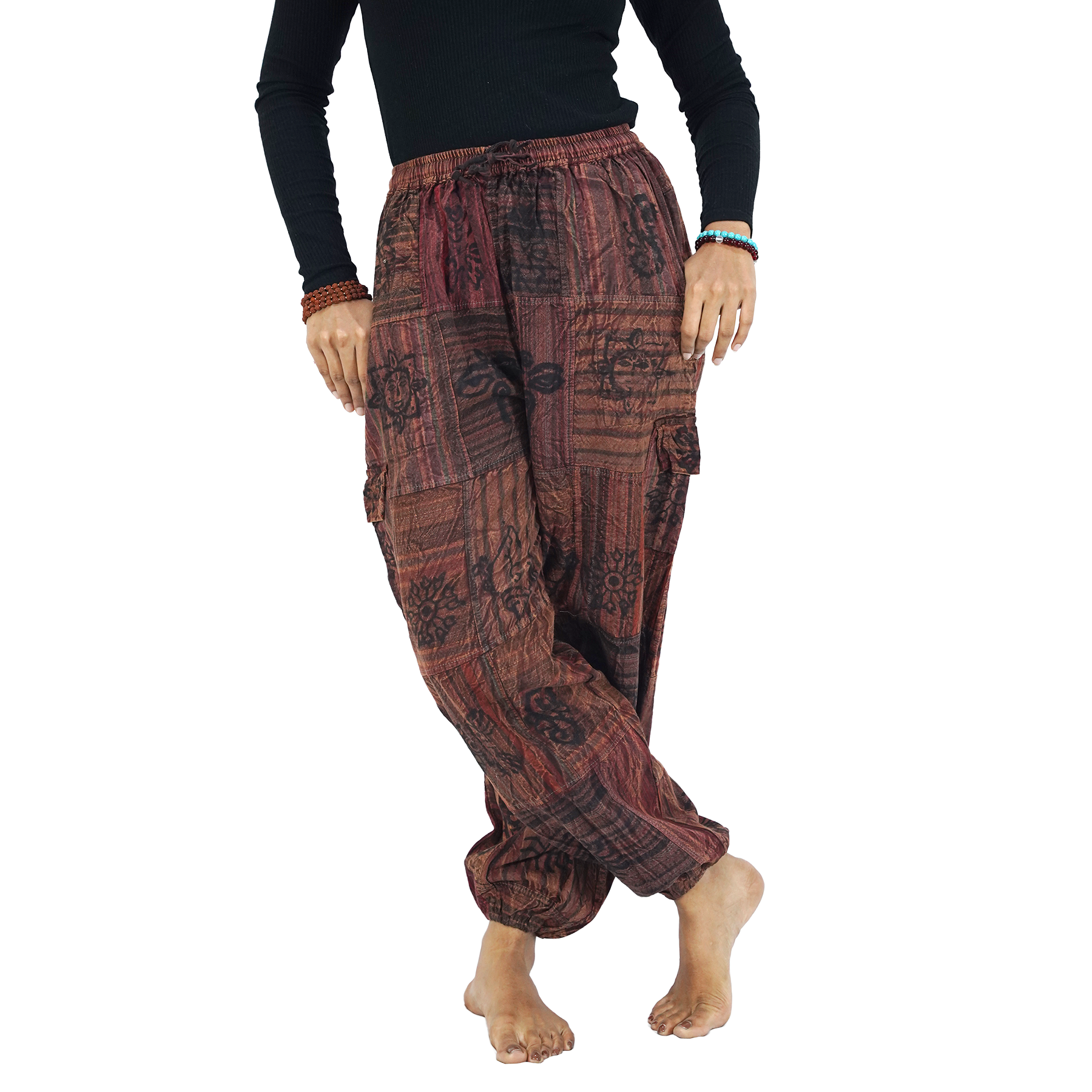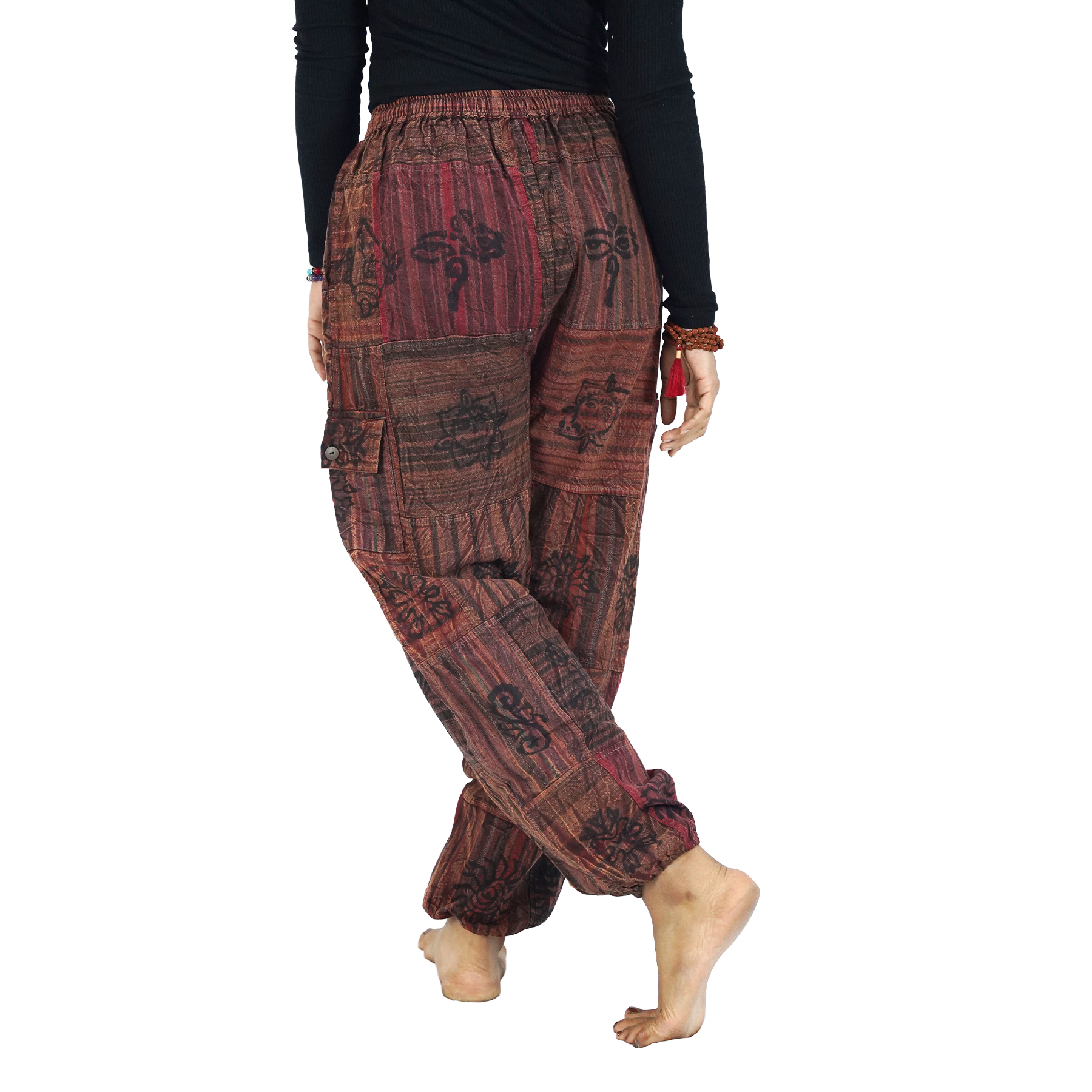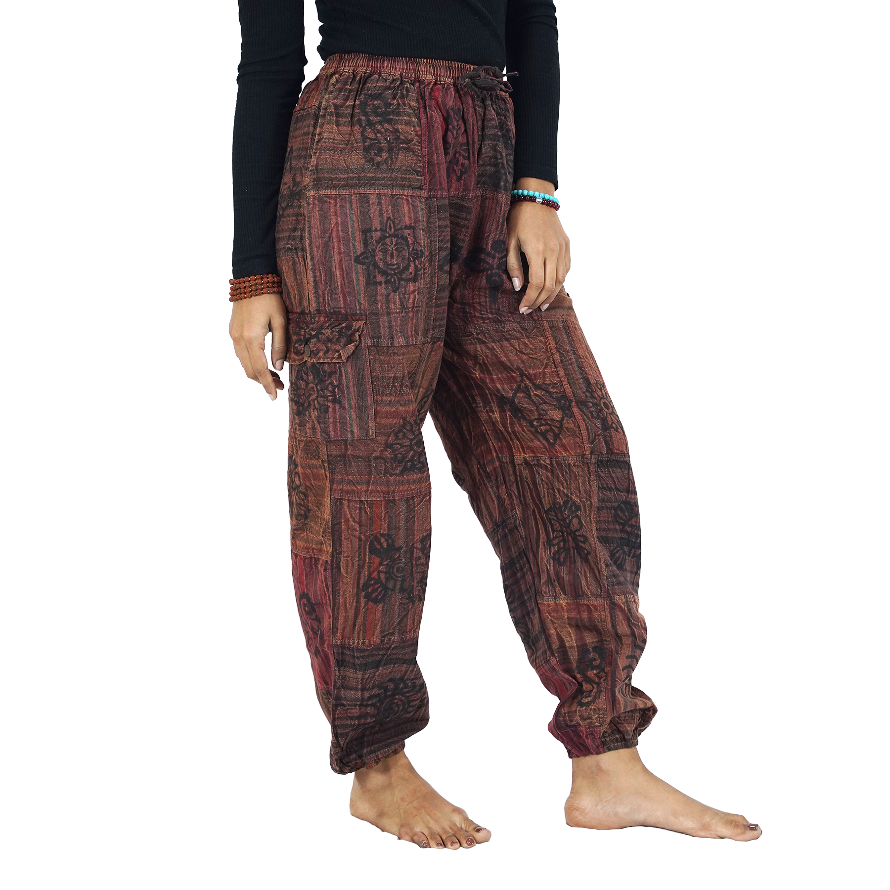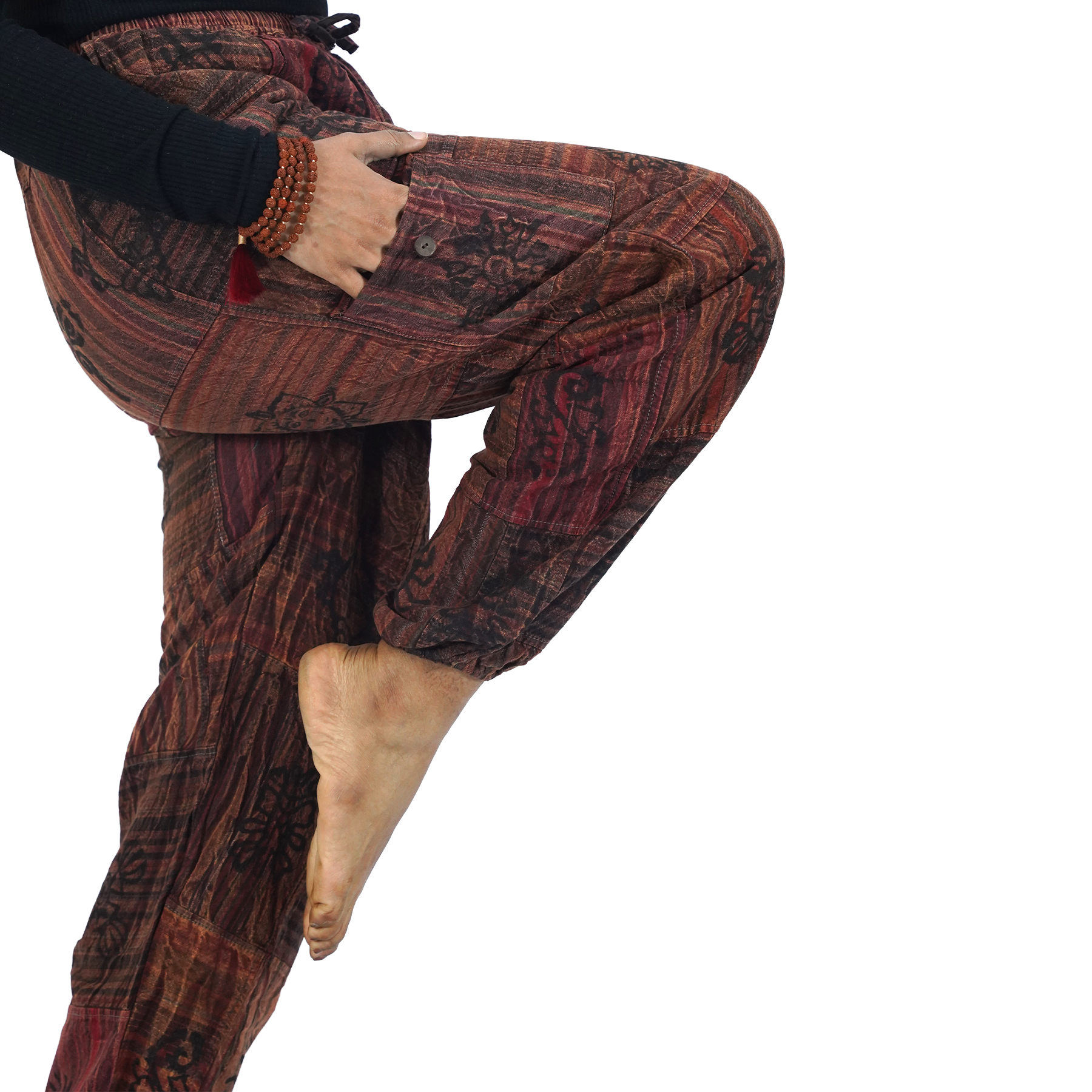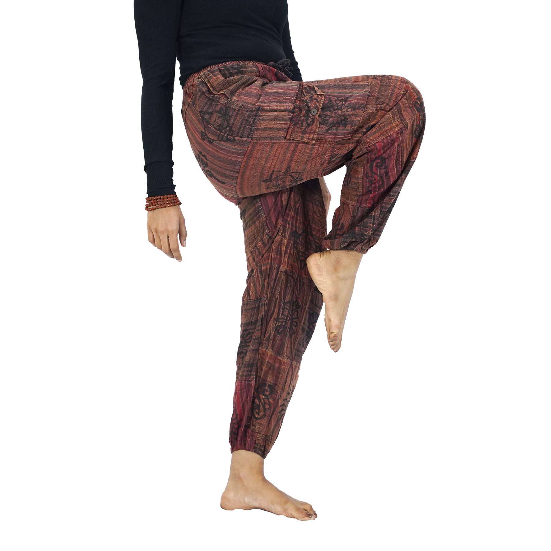 Bring a touch of earthy elegance to your wardrobe with the Satyugyoga Classic Straight Harem Pants in reddish brown and black striped patchwork.